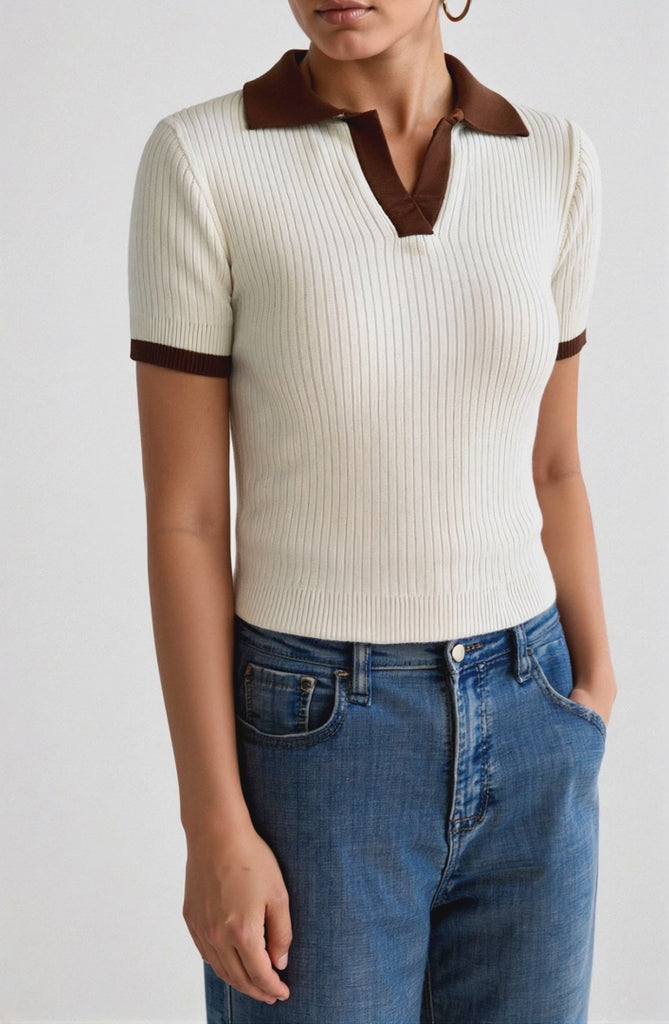 This top's notched polo collar and color block pattern create a striking look that blends old money elegance with modern style. The semi-sheer fabric adds a touch of allure, making it perfect for both casual outings and more polished events. Pair it with tailored trousers for a refined look or with jeans for a chic, casual style.