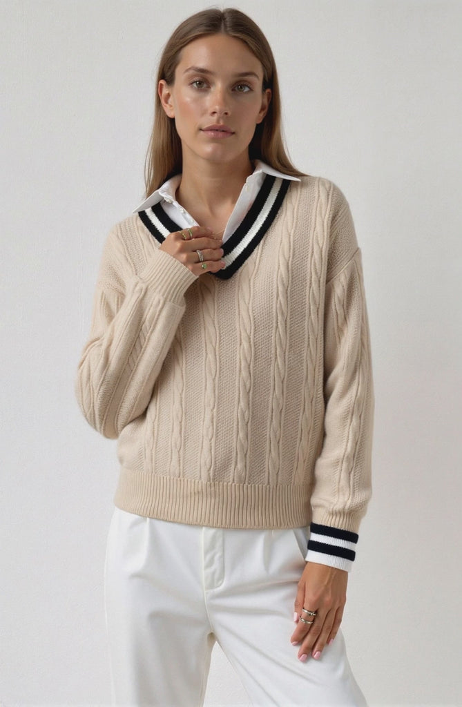 Old Money Contrast Trim V Neck Elegant Cable Knit Long Sleeve Sweater