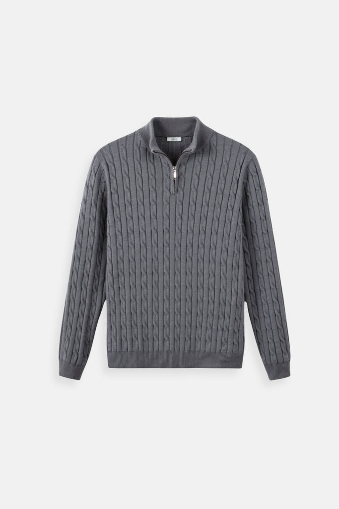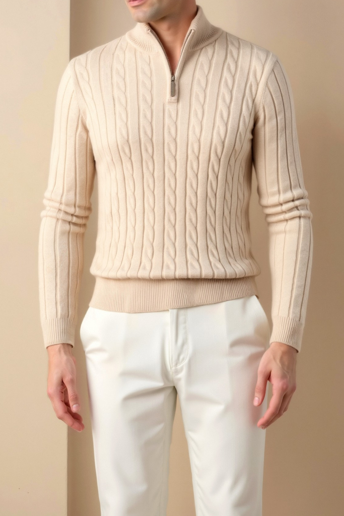 Introducing our Smart Luxury Cable Knit Zip Sweater, designed to capture the essence of quiet luxury and the old money lifestyle. This elegant piece features a stand collar and a quarter zip, making it both stylish and functional. The sweater has a regular fit with a flared hem, offering a refined silhouette perfect for fall and winter. The stripe pattern adds a touch of sophistication, while the slight stretch fabric ensures comfort and flexibility.