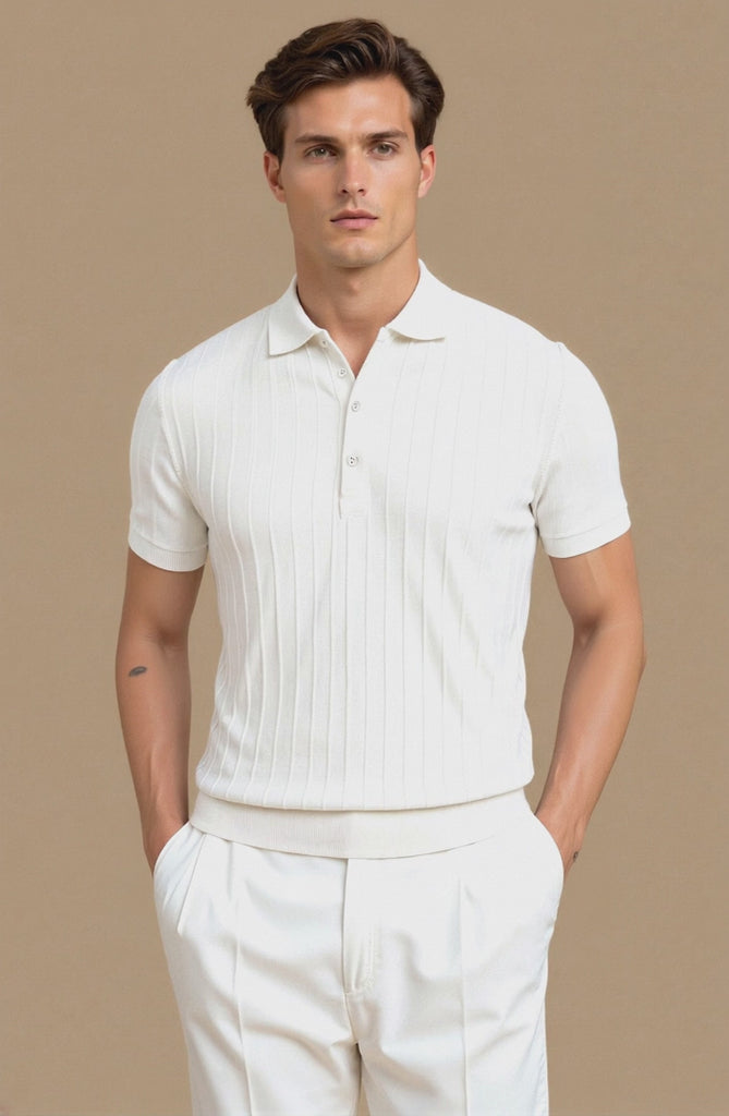 This polo T-shirt is perfect for a range of occasions, from casual outings to more refined events. Its vertical stripes and button-up design make it a stylish choice that can easily transition from day to night, embodying the essence of sophisticated elegance.