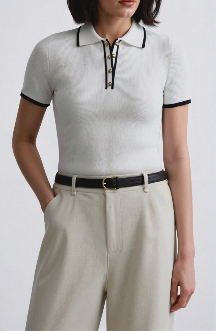 This polo T-shirt’s slim fit and elegant contrast trim add a sophisticated touch to a classic design. The V-neck and high stretch fabric provide both style and comfort, making it ideal for a range of casual occasions. Whether paired with jeans for a relaxed look or with chinos for a more polished appearance, this piece effortlessly embodies old money elegance with modern flair.