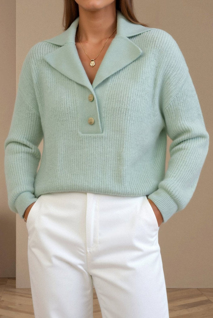 Feel confident and cozy with the Elegant Solid Color Wide Collar Button Sweater. This sweater is perfect for cooler spring and fall days, giving you a classy look with soft comfort.