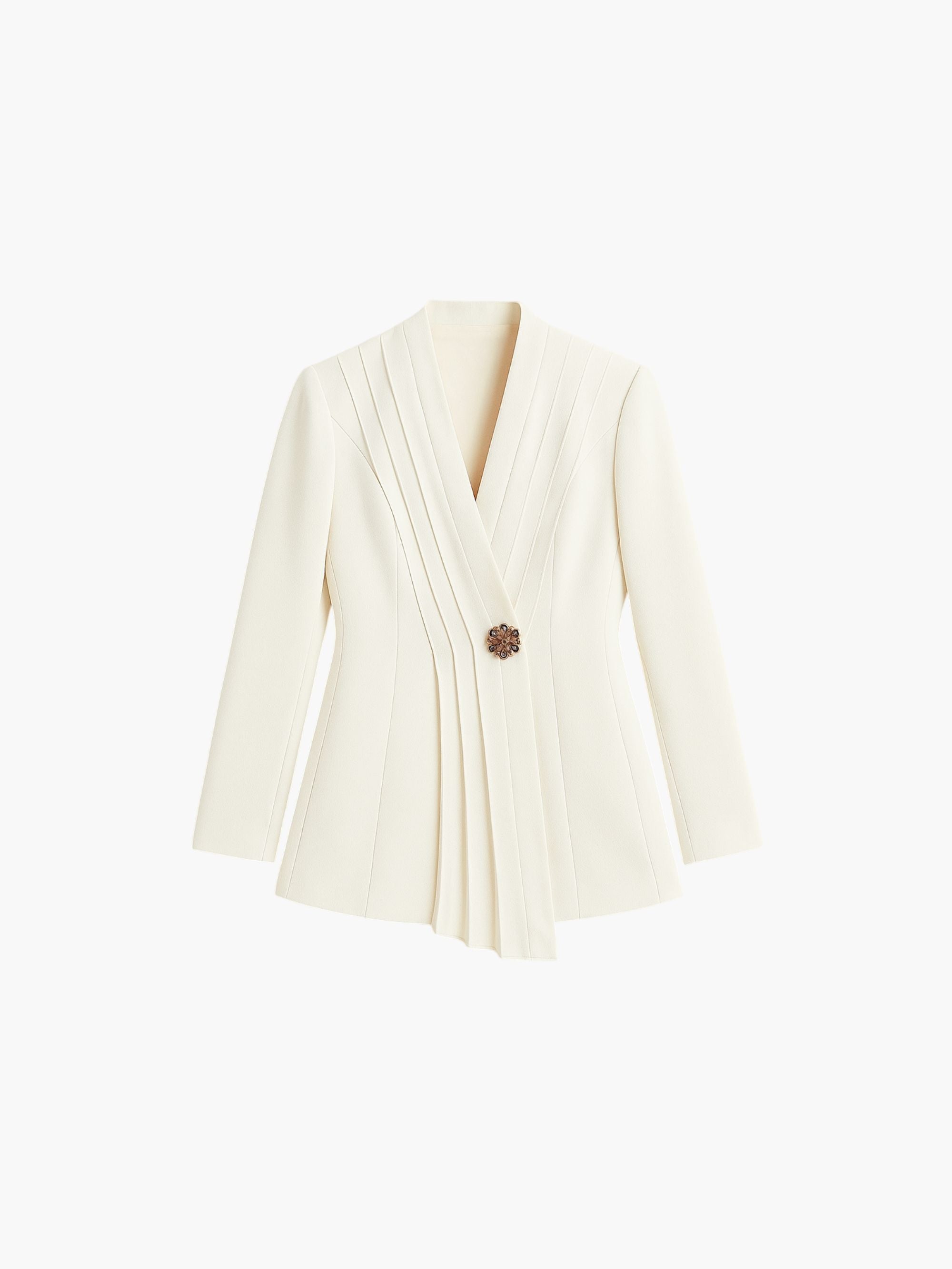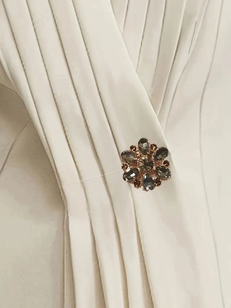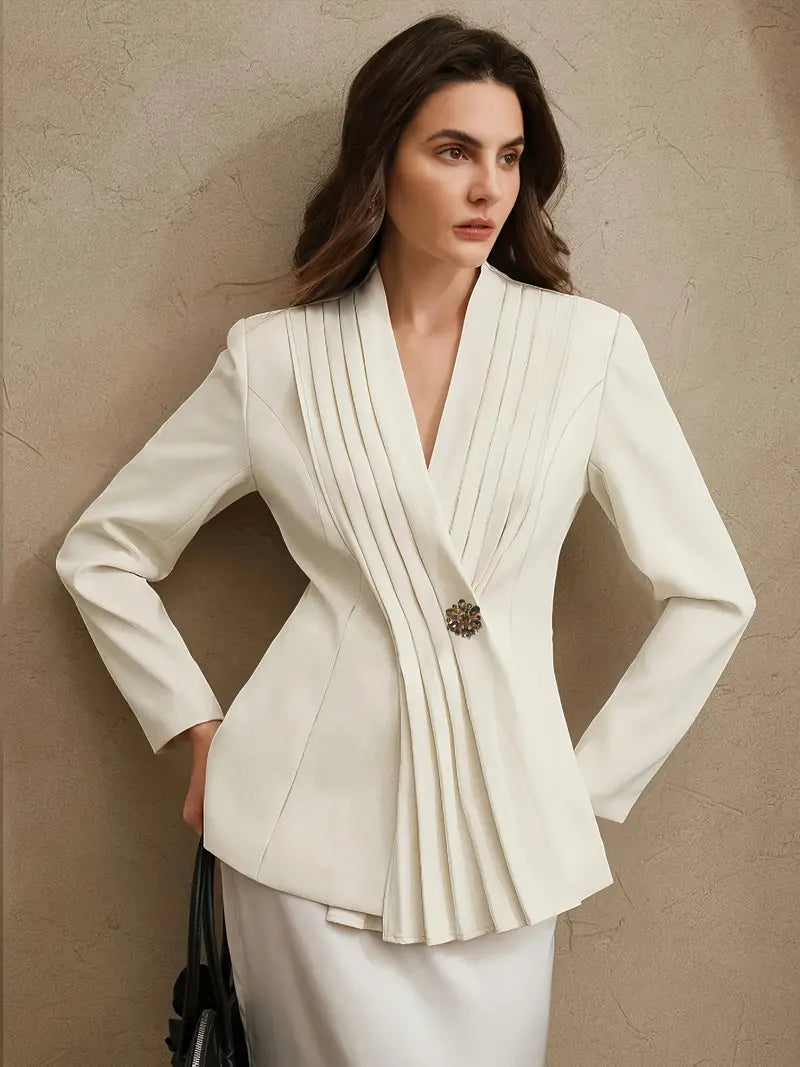 The pleated fabric and V-neck cut create a refined, feminine silhouette that works for both formal and casual occasions.